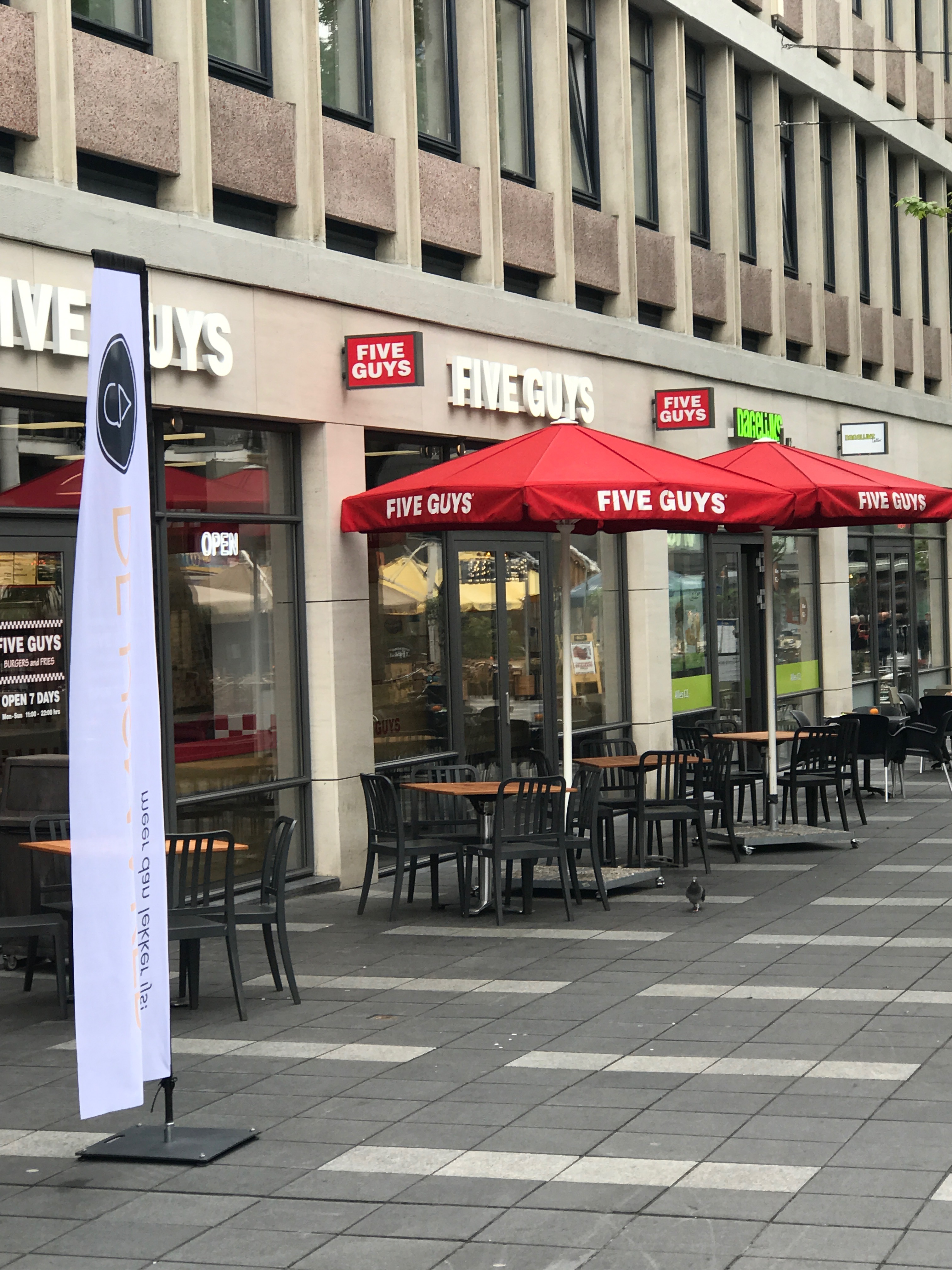 Five Guys zit sinds een paar maandjes op het stadhuisplein in Rotterdam. Dit fastfoodketen is over komen vliegen uit Amerika. Ze staan bekend om hun verse producten en hun patatjes gefrituurd in pindaolie. Zeker een aanrader.